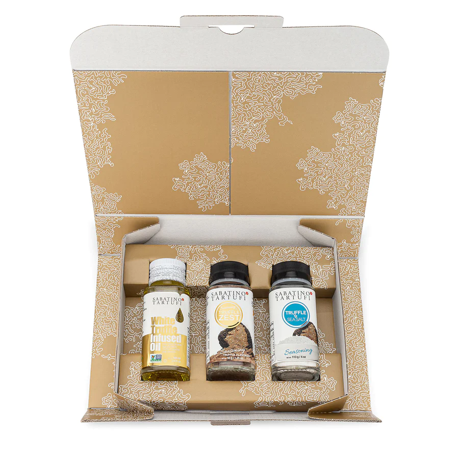 Comprar colección de aceites de trufa Sabatino. Este set de regalo con trufa es el obsequio ideal tanto para los amantes de la trufa como para aquellos que nunca la han probado. La caja regalo incluye tres productos diferentes con trufa: aceite con trufa blanca, trufa y sal marina, y Truffle Zest®. En segundo lugar, los mejores chefs del mundo utilizan este producto para obtener los mejores resultados en la cocina, y Sabatino Tartufi le ofrece la oportunidad de utilizarlo en su propia cocina. Además, nuestro producto es el mejor del mundo online en Bend, Oregón. Otros estados también recurren a nosotros para comprar online aceite con infusión de trufa Sabatino y nos aseguramos de entregarlo según lo previsto y sin demora.